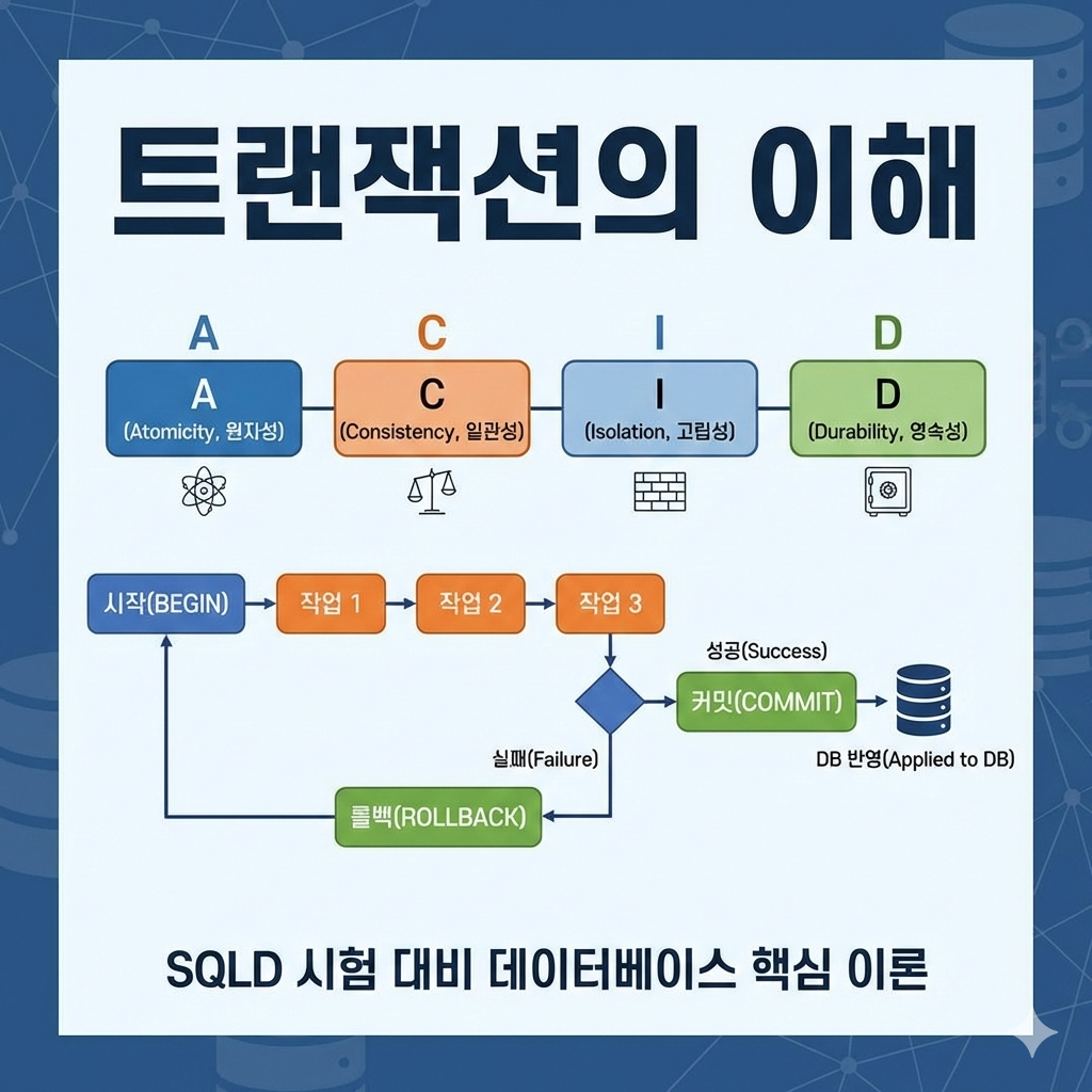 - ACID: 전부성공/전부실패(원자성), 규칙 유지(일관성), 동시 실행 간섭 최소(고립성), 결과 보존(지속성)